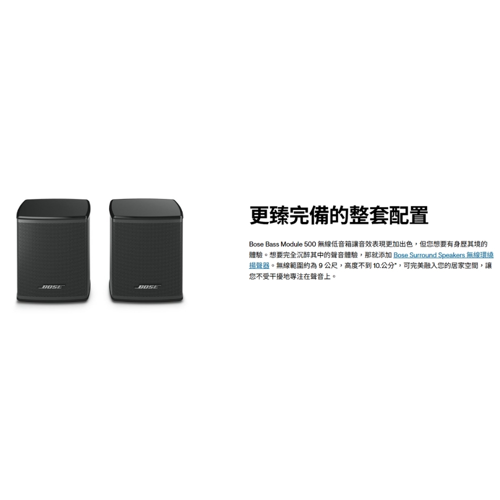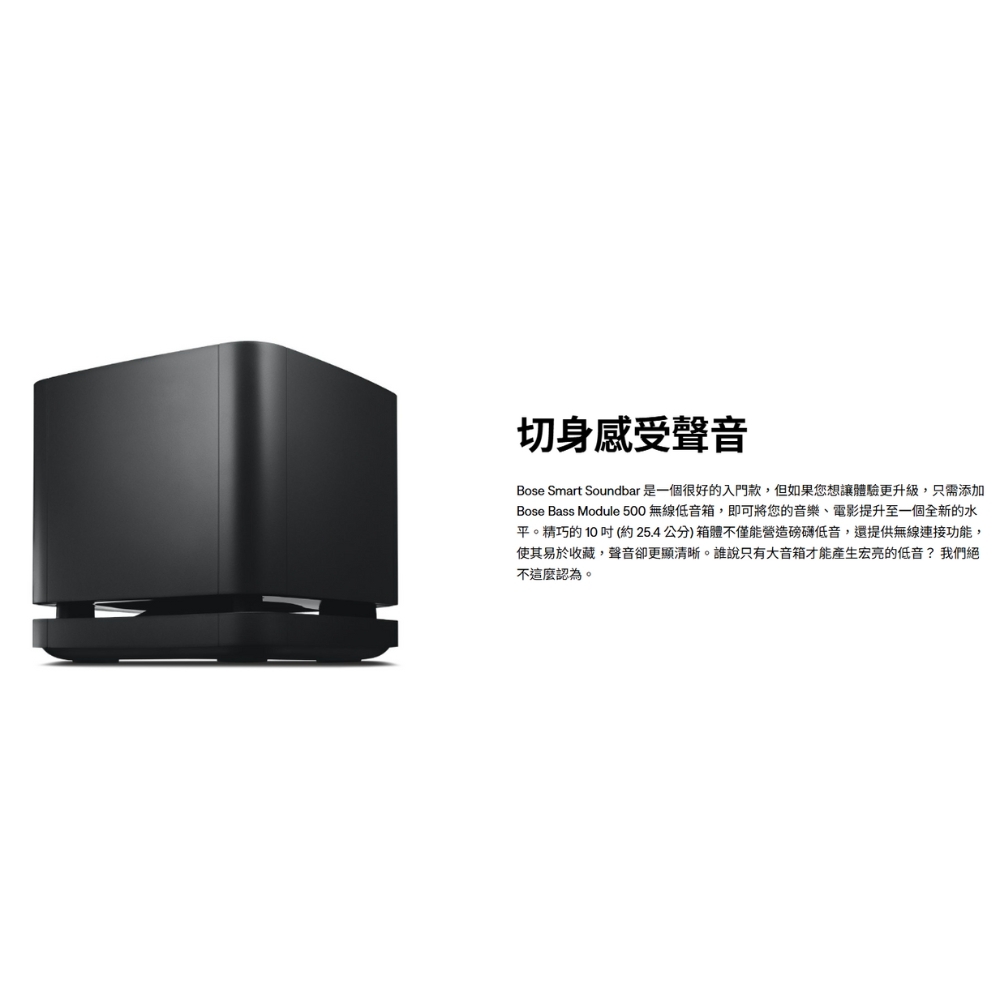 Bose Smart Soundbar 是一個很好的入門款,但如果您想讓體驗更升級,只需添加 Bose Bass Module 500 無線低音箱,即可將您的音樂、電影提升至一個全新的水平。精巧的 10 吋 (約 25.4 公分) 箱體不僅能營造磅礴低音,還提供無線連接功能,使其易於收藏,聲音卻更顯清晰。誰說只有大音箱才能產生宏亮的低音? 我們絕不這麼認為。