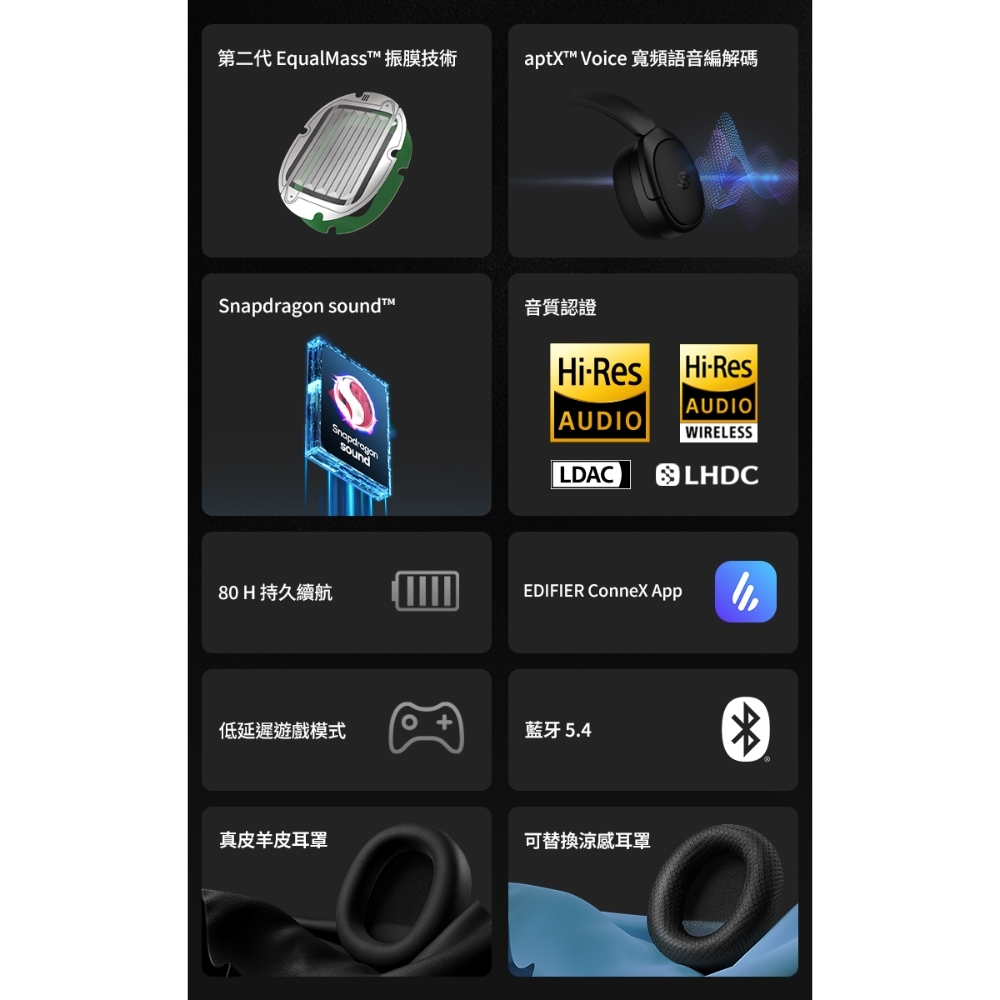 .支援 Snapdragon Sound、高通®aptX™ Lossless、高通®aptX™Adaptive、高通aptX™HD、高通apt,LHDC、LDAC、AAC、SBC等高音質解碼技術