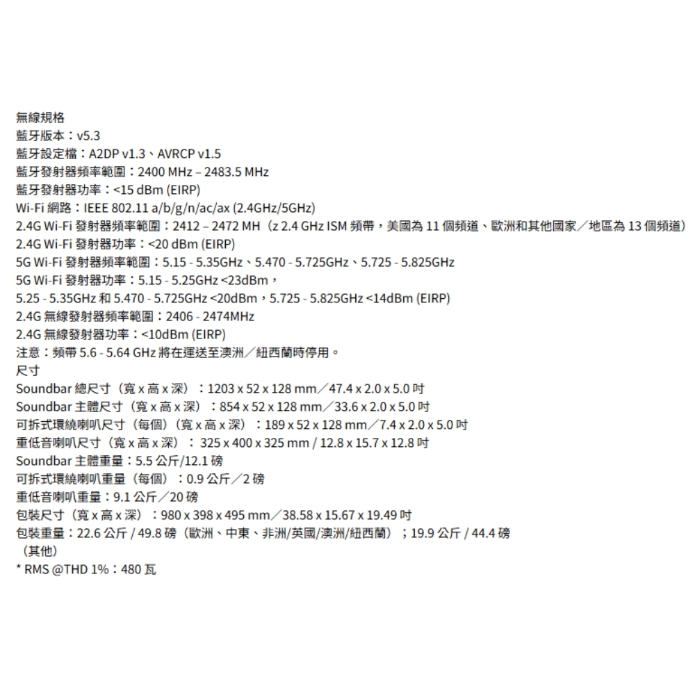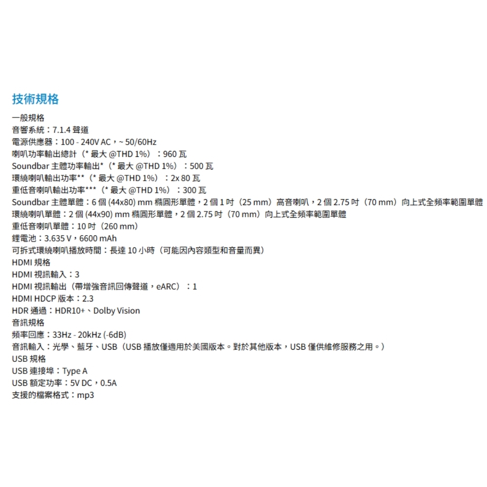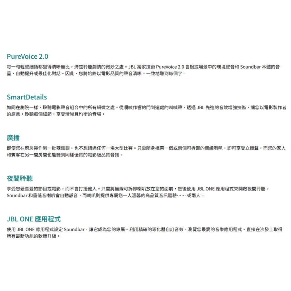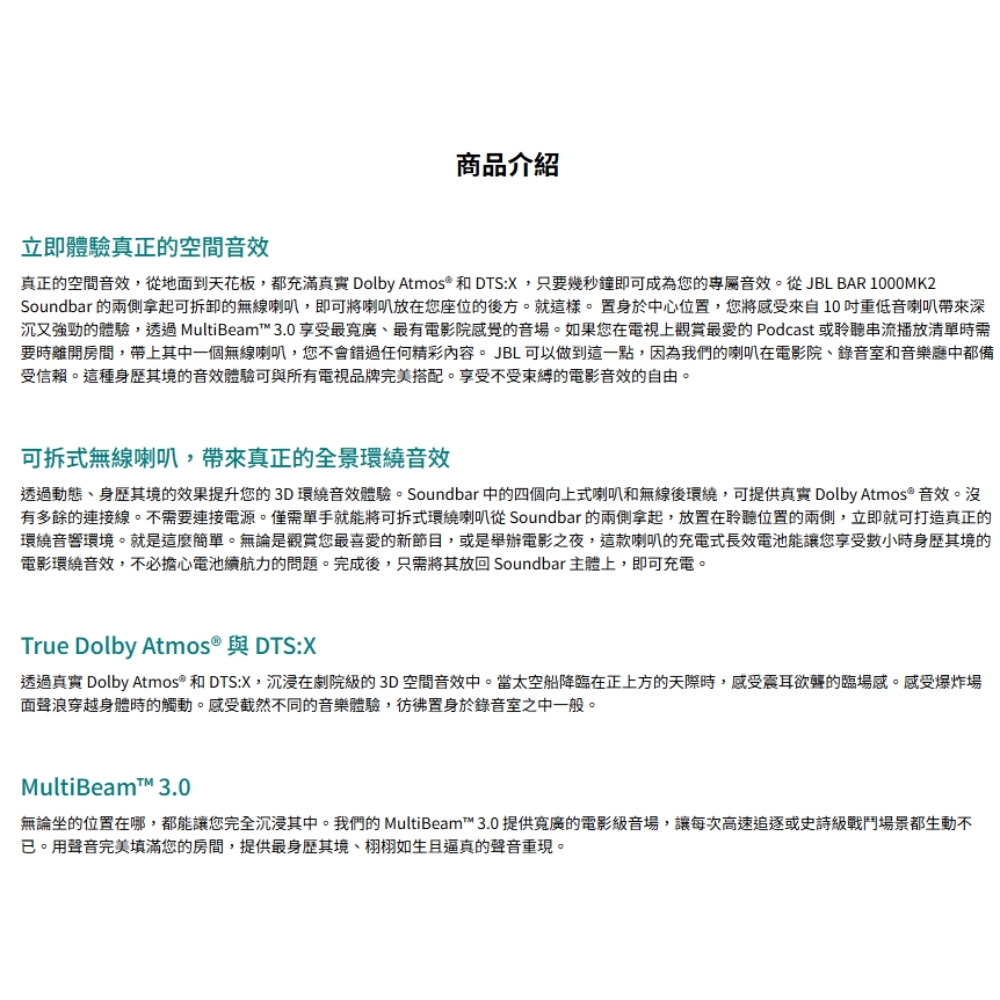 可拆式無線喇叭,帶來真正的全景環繞音效 / 960 瓦最大輸出功率和 10 吋無線重低音喇叭 / True Dolby Atmos® 與 DTS:X / MultiBeam™ 3.0 / PureVoice 2.0 / SmartDetails / 廣播 / 夜間聆聽 / 輕鬆完成聲音校準 / 適用於所有生態系統和音樂串流服務 / JBL ONE 應用程式