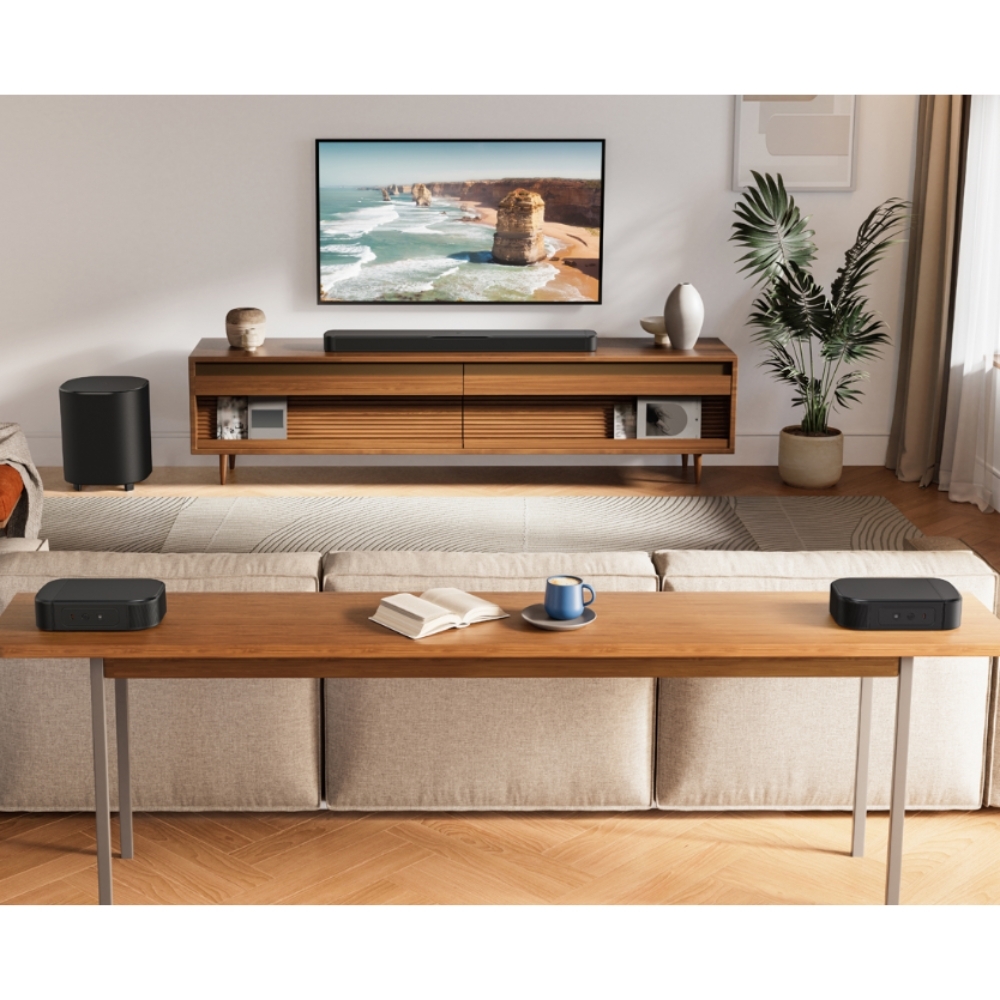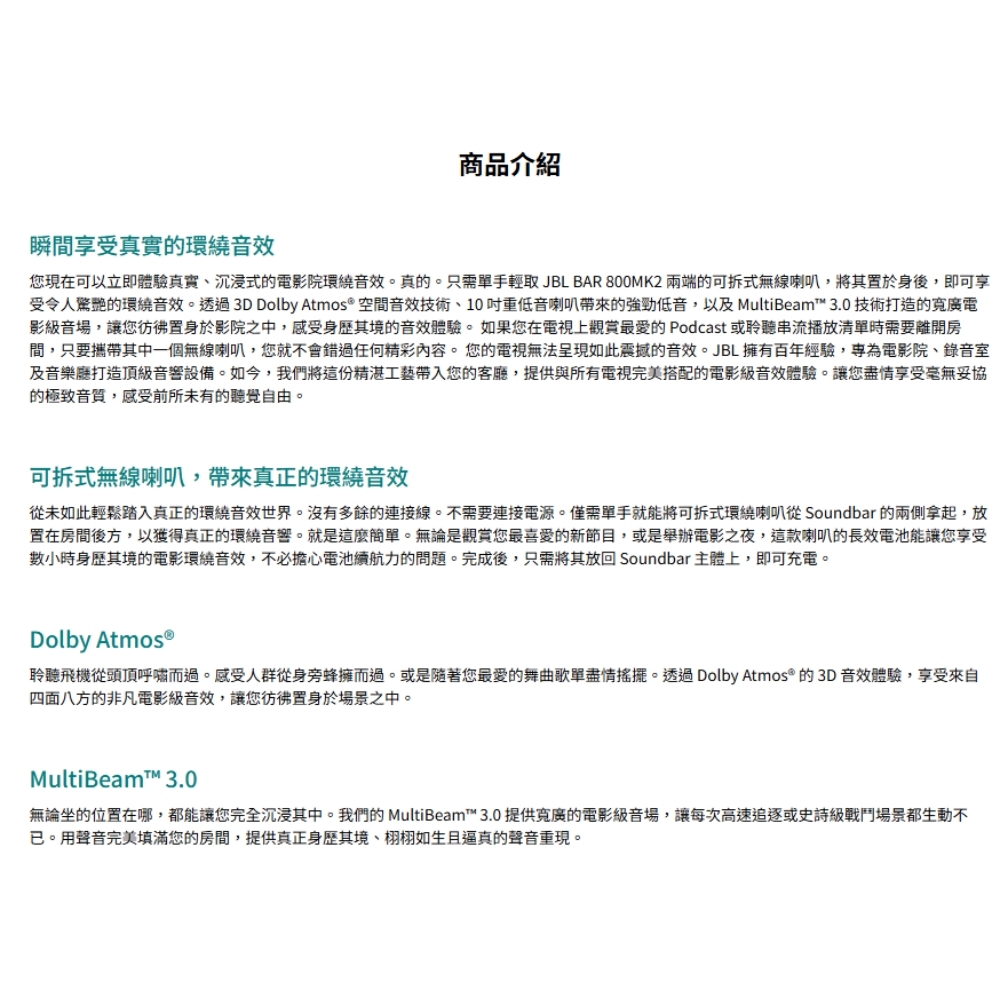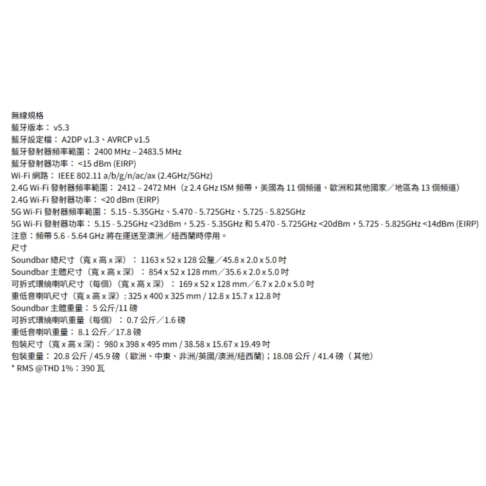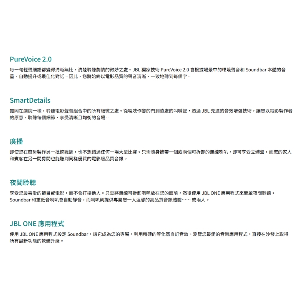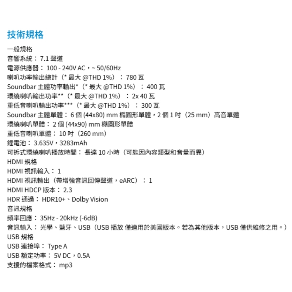 可拆式無線喇叭,帶來真正的環繞音效 / 780 瓦最大輸出功率和 10 吋無線重低音喇叭 / MultiBeam™ 3.0 / PureVoice 2.0 / SmartDetails / 廣播 / 夜間聆聽 / 輕鬆完成聲音校準 / 適用於所有生態系統和音樂串流服務 / HDMI eARC 搭載 4K Dolby Vision Passthrough