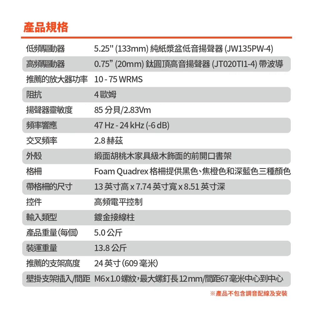 ♦ 搭載了全新研發的19mm鈦金屬高音和133mm直徑白色純紙漿低音