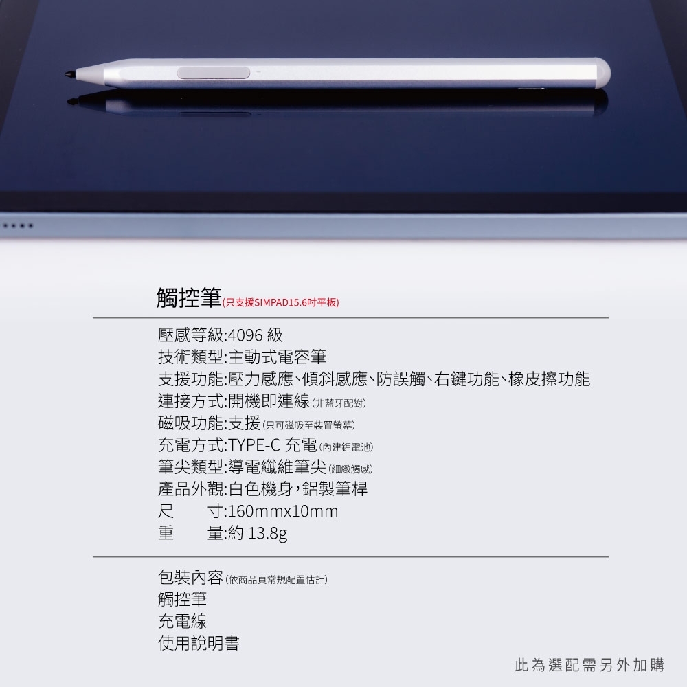•壓感等級:4096 級 (只支援SIMPAD15.6吋平板)