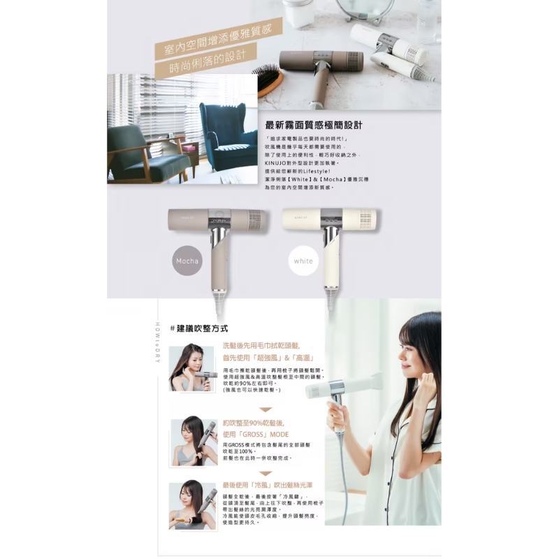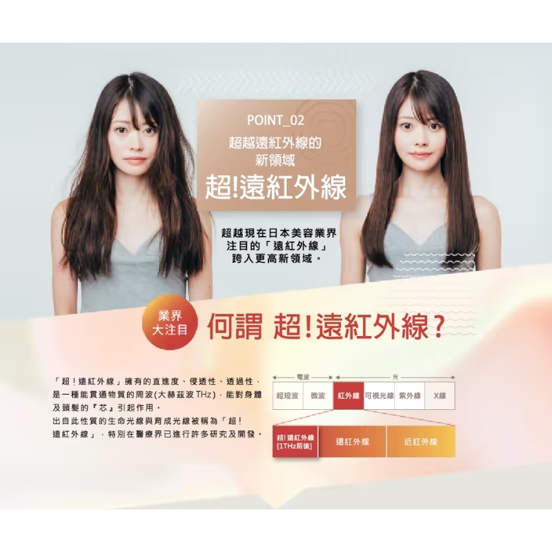 ✦ 日本美容業界大注目「超遠紅外線」從髮絲內部分子發熱速乾頭髮,潤澤髮絲、保護頭皮。