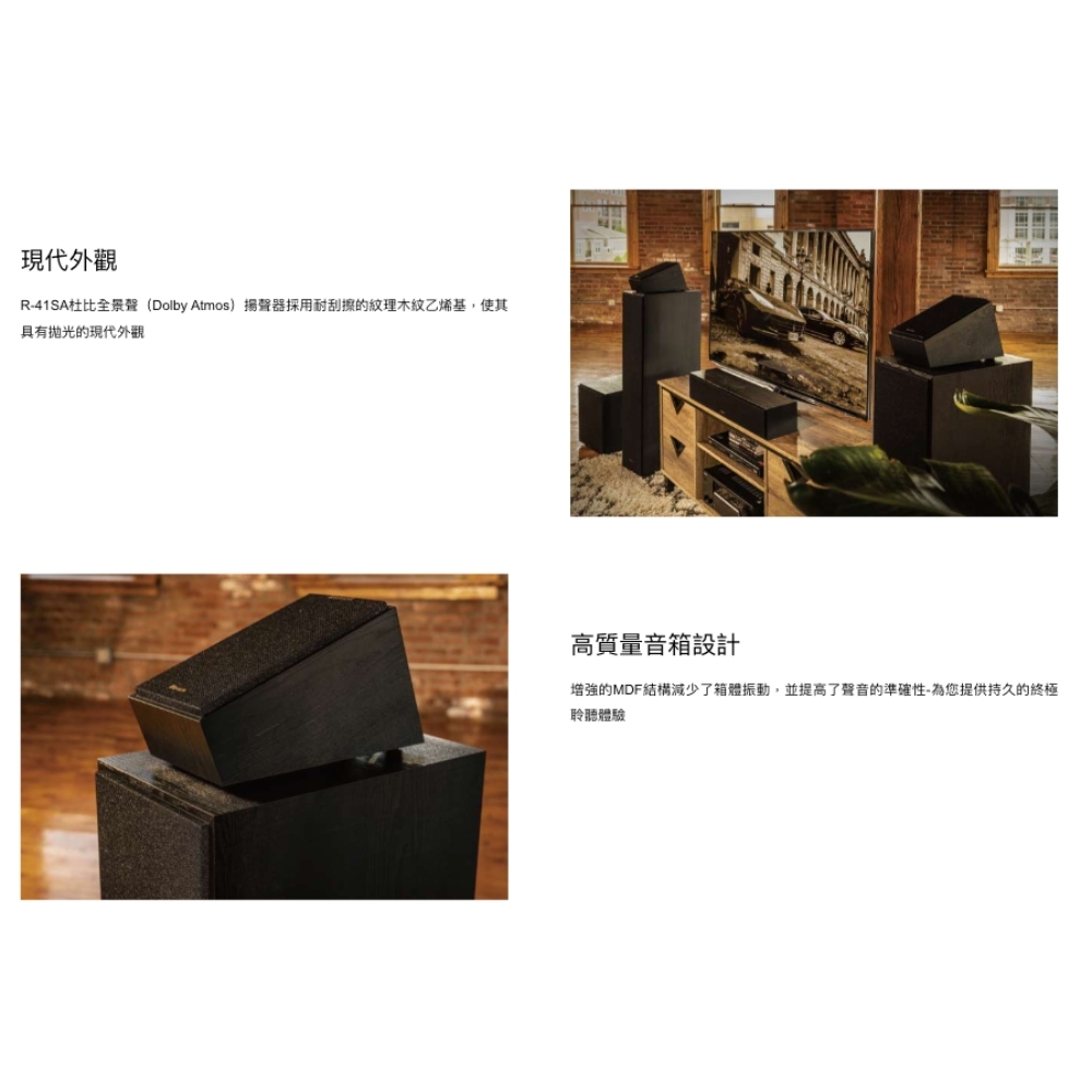 R-41SA利用Klipsch專有的喇叭加載的受控指向性技術,將聲音從天花板反射回去,營造出驚人的身臨其境的聆聽體驗