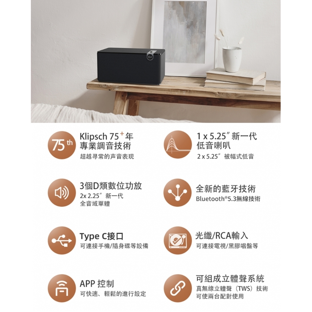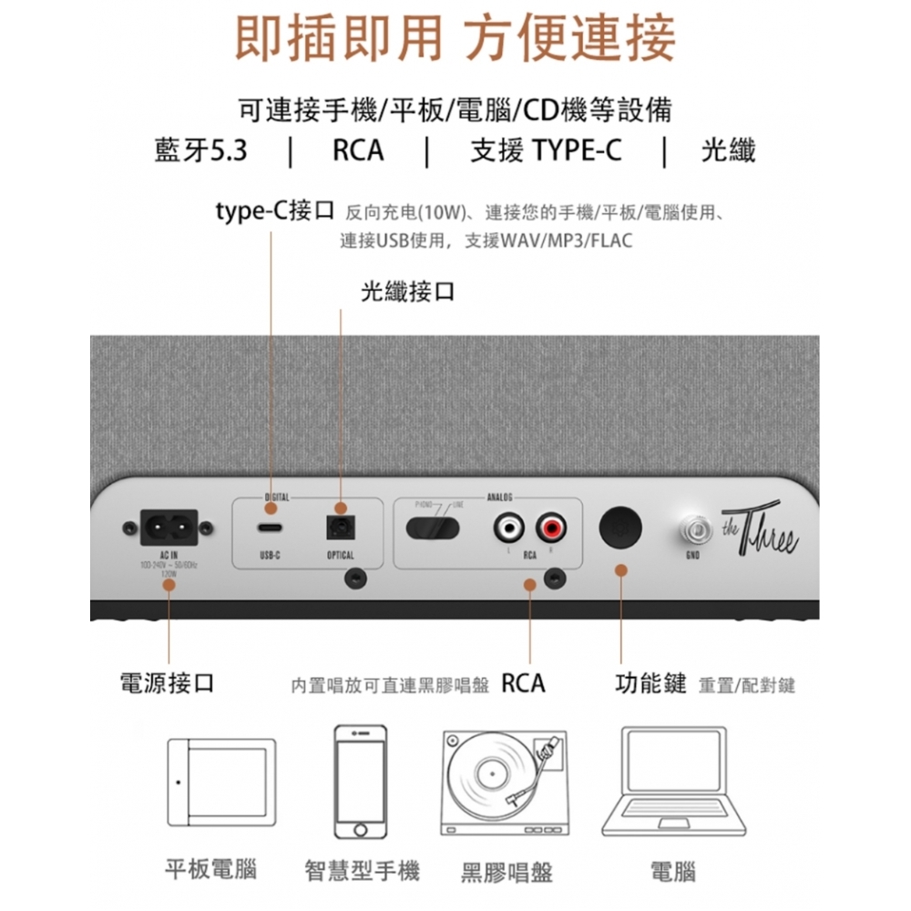 通過Phono/RCA 端⼝,可連接⿊膠唱盤