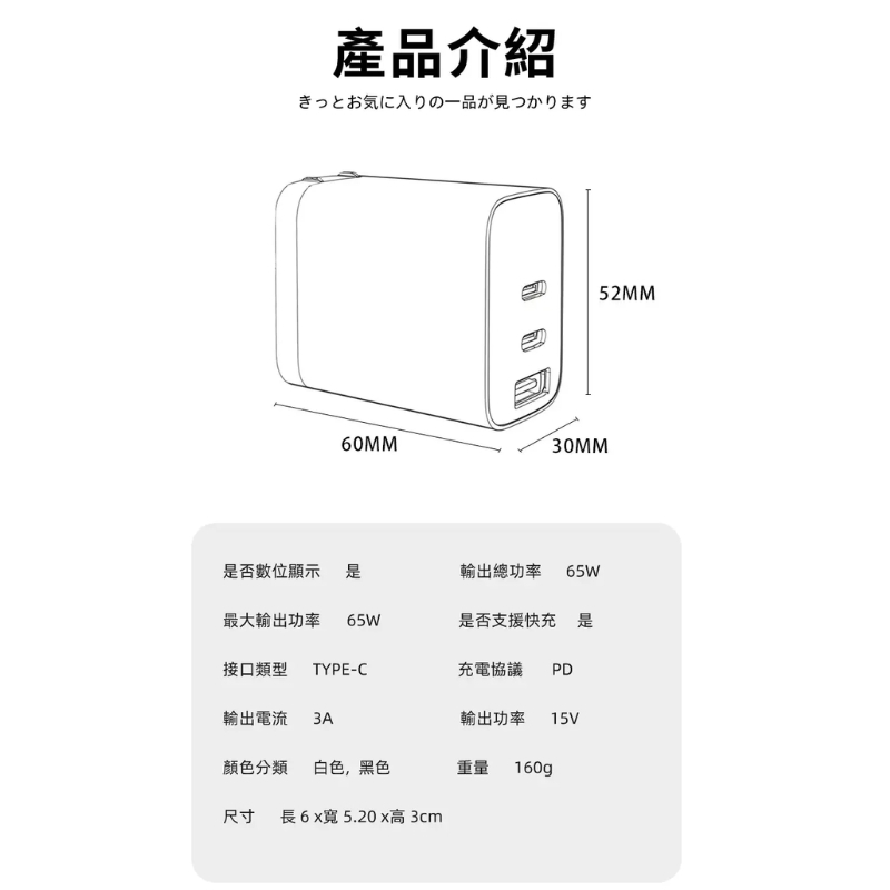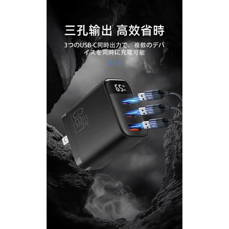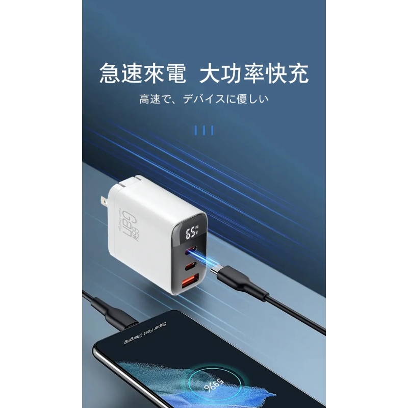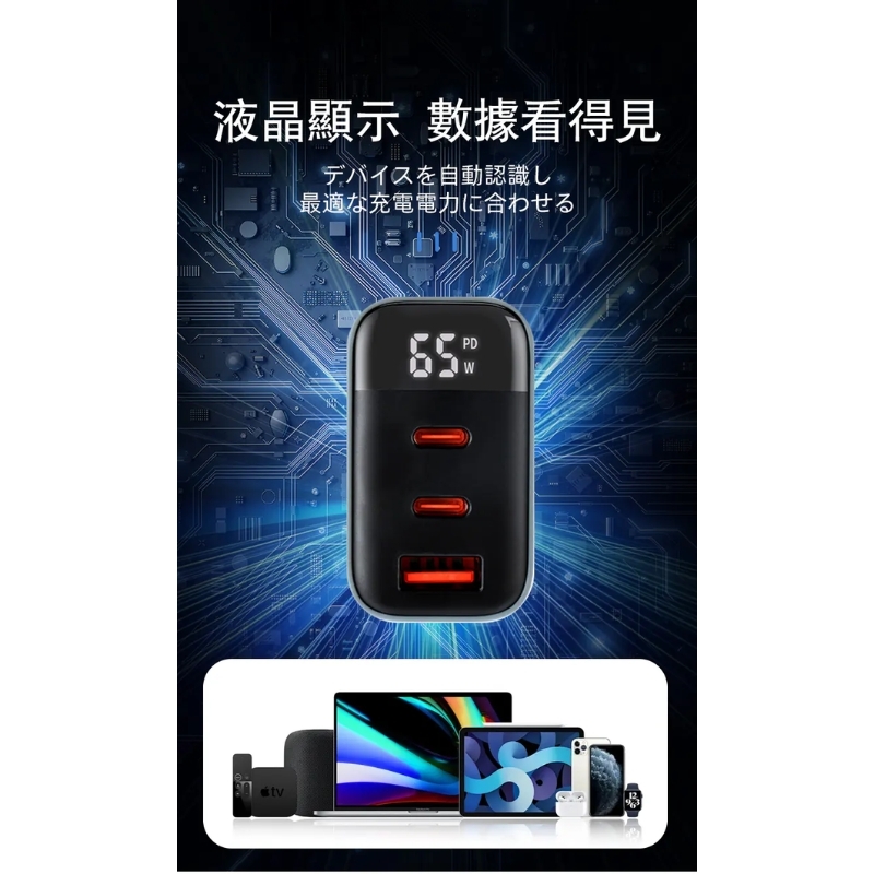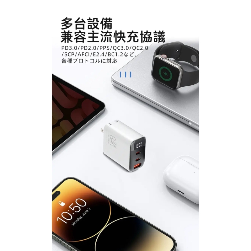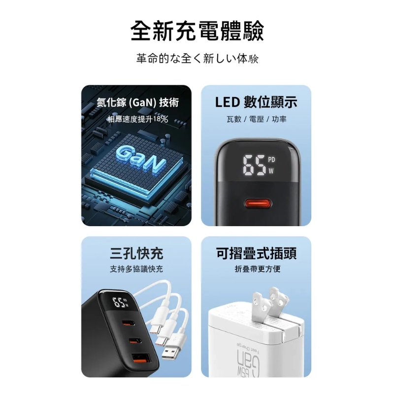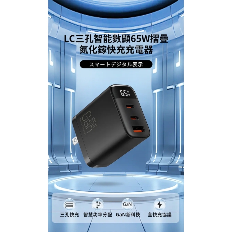 【LC生活科技】三孔智能數顯65W摺疊氮化鎵快充充電器