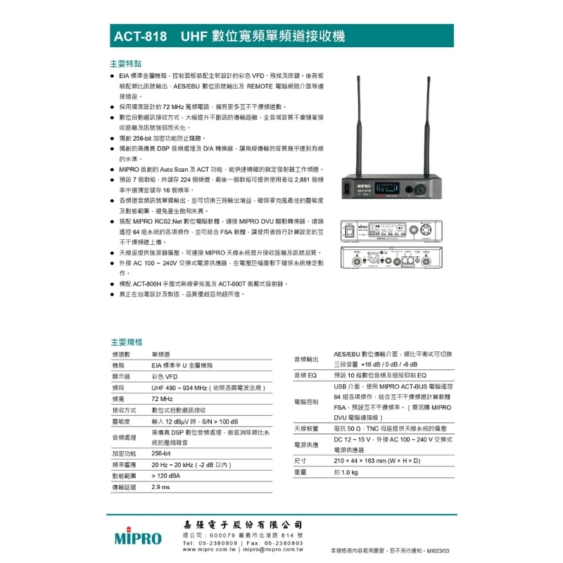 MIPRO ACT-818 UHF數位寬頻單頻道接收機ACT-818-身為無線麥克風的領航者MIPRO
