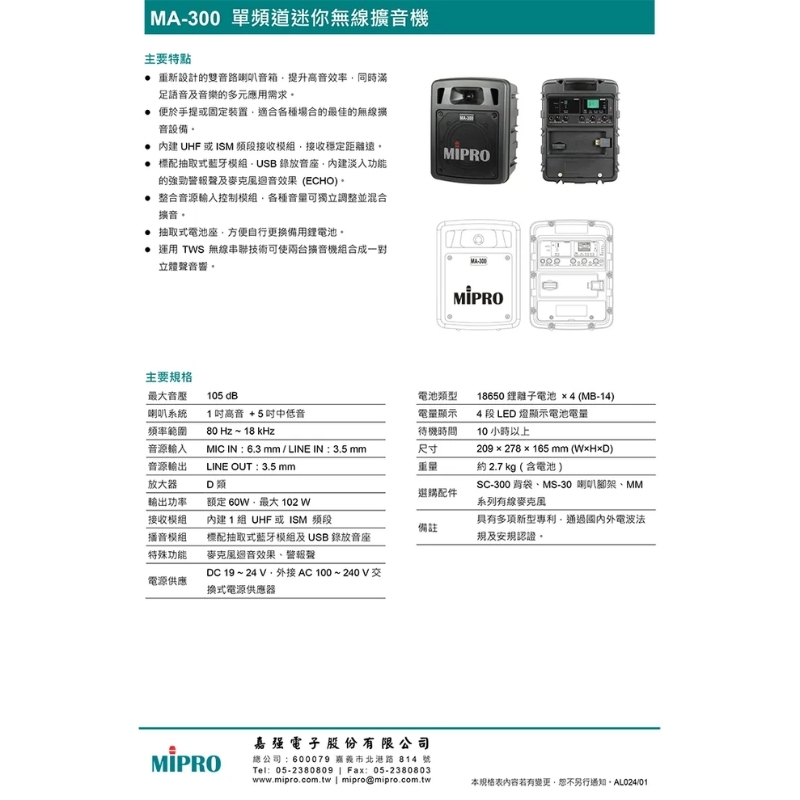 MA-300-MIPRO創新整合無線麥克風與擴音系統,自推出以來,憑藉多功能、高品質及卓越音質,獲得廣泛使用與認可,成為品牌的核心產品