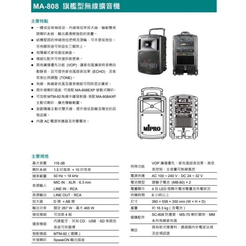 MA-808是MIPRO手提式無線擴音機擁有Hi-Fi音效、功能及特性全面升級的創新豪華機種