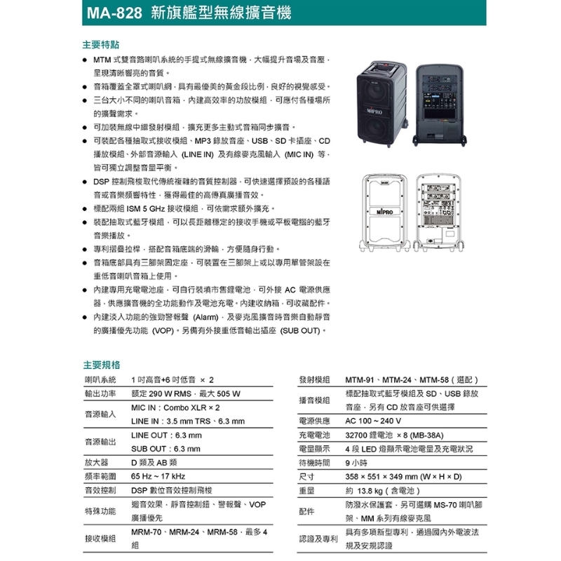 MA-828 PLUS-MIPRO創新整合無線麥克風與擴音系統,自推出以來,憑藉多功能、高品質及卓越音質,獲得廣泛使用與認可,成為品牌的核心產品