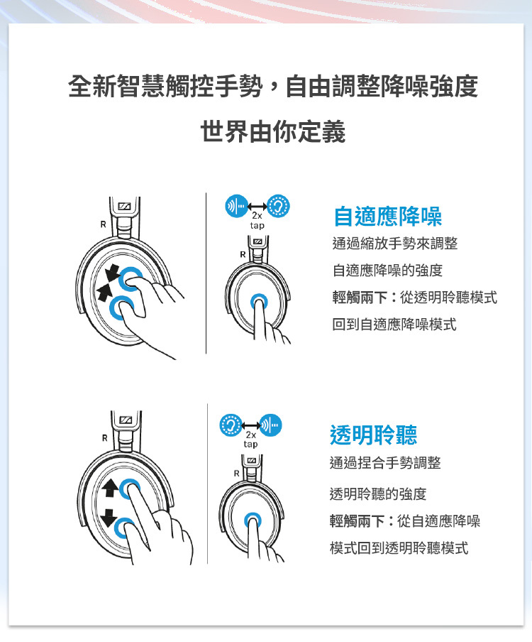●可觸控調節透明聆聽及自適應降噪
