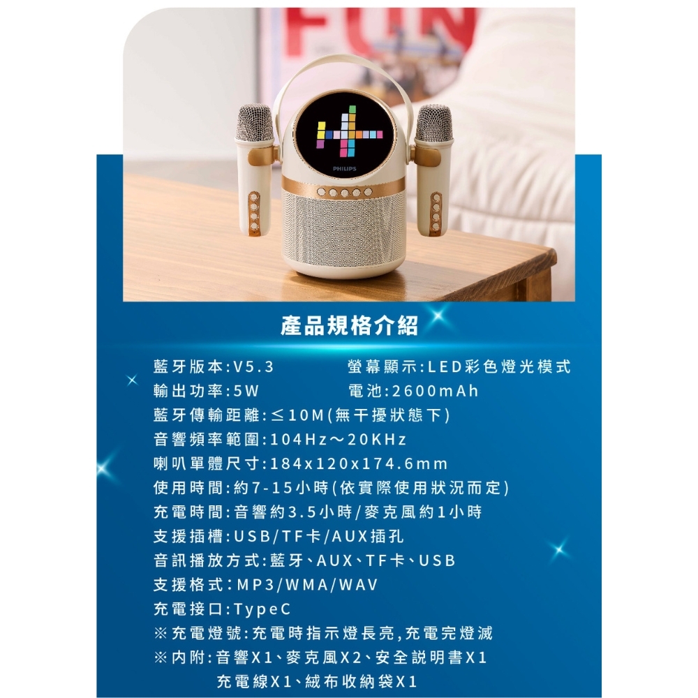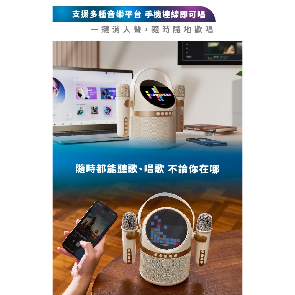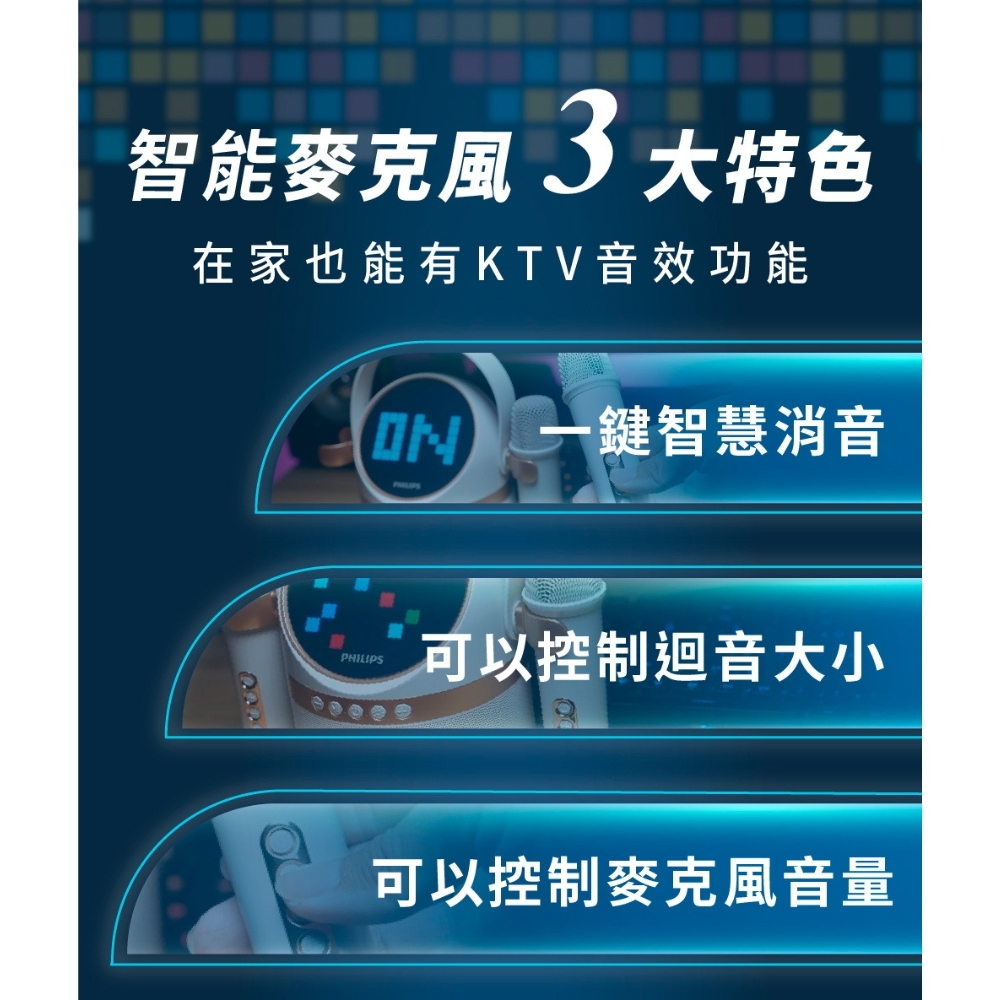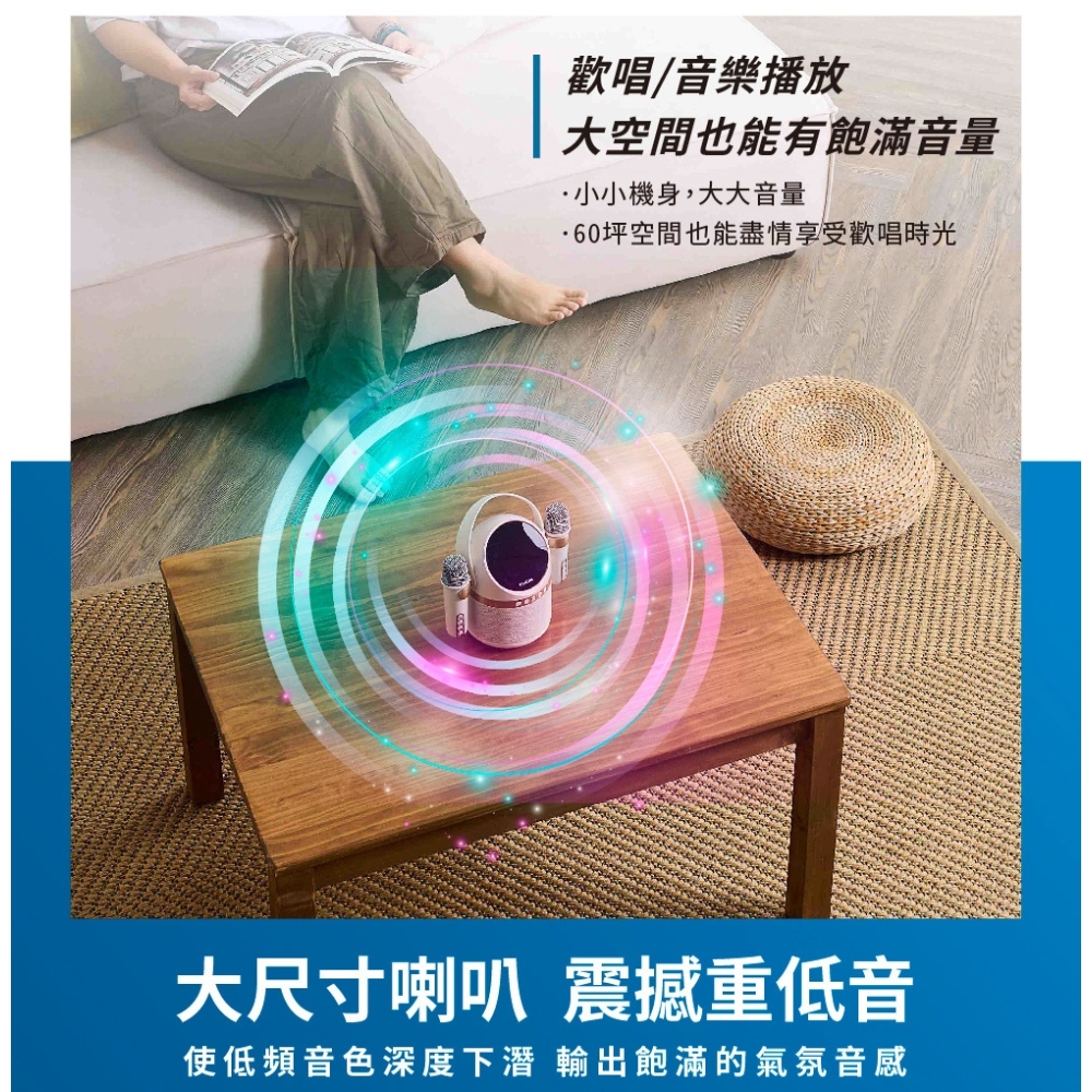‧ 配備2支K歌智能麥克風,可一鍵消除人聲伴唱,加入迴音特效。