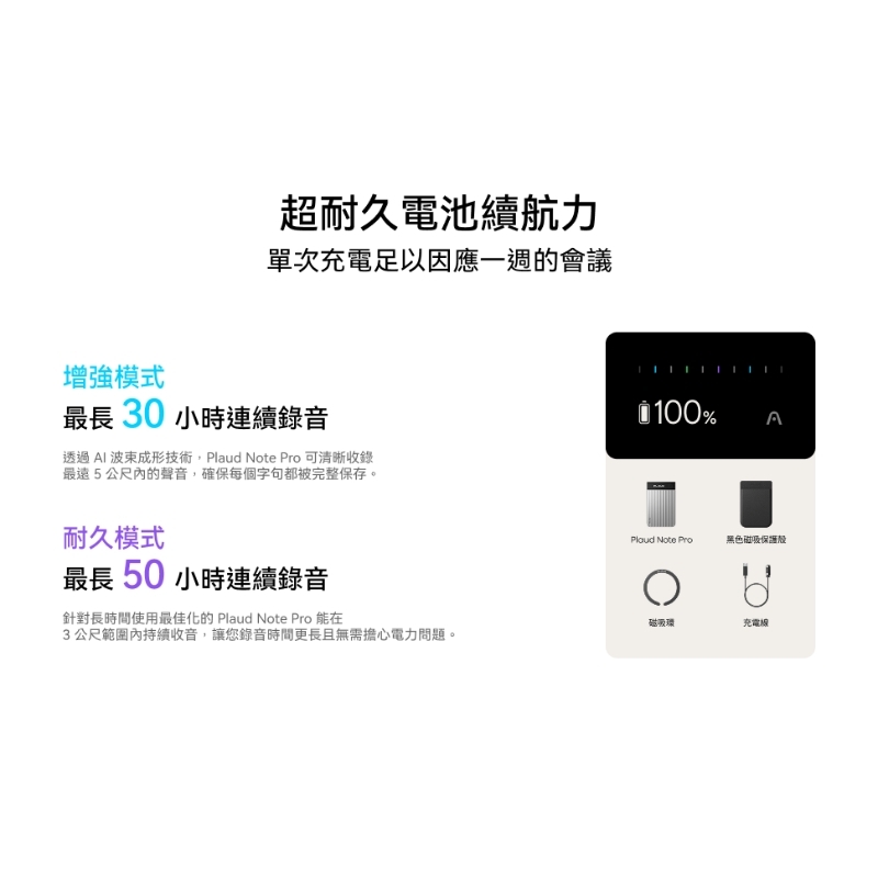●最長50小時連續錄音(達5小時會分隔音檔),待機時間最長達60天。