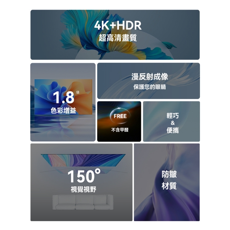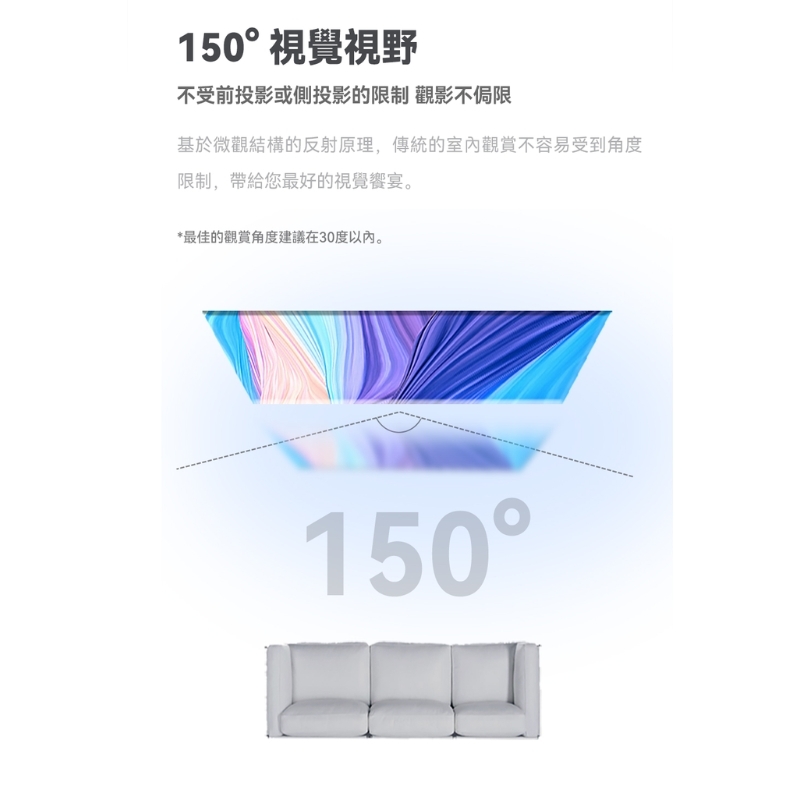 ※廣視角體驗:150° 視覺視野,適合多角度觀賞,不受投影限制