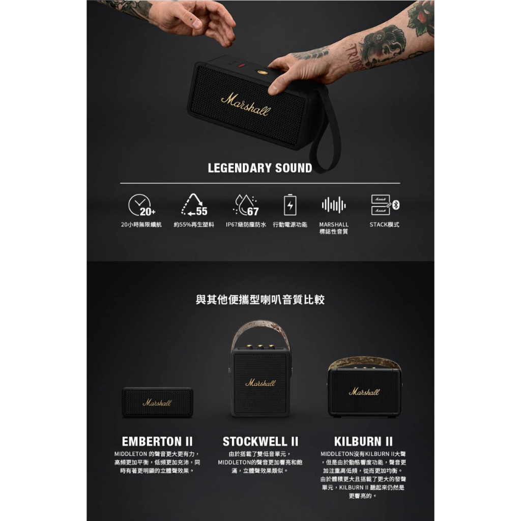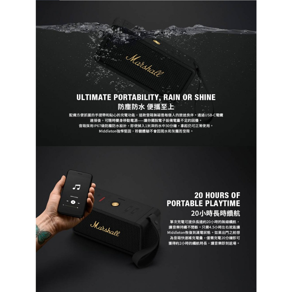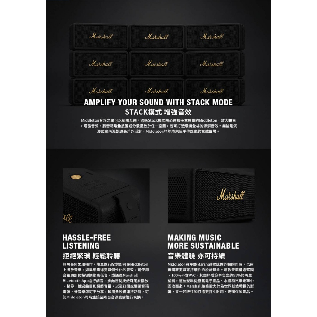 Middleton搭載了Marshall獨特的多聲場立體聲技術,在任何場景下都能傳遞空間感十足的聲音,帶你感受立體音效帶來的流動旋律。360度環繞音效,使你所在之處皆如音樂現場