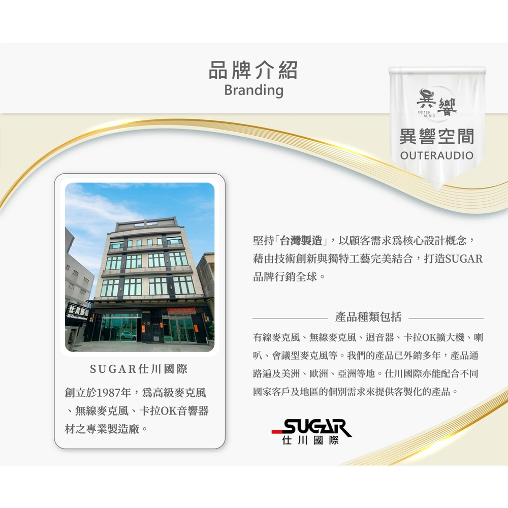 SUGAR品牌音響設備享譽台灣20餘年,產品舉凡功率擴大機、有線無線麥克風、各類音效處理器、專業品質揚聲器,深受廣大客戶愛用,無論家庭劇院、舞台音響、各大知名KTV與商業或是公共空間,SUGAR都提供了消費者最大的使用樂趣。